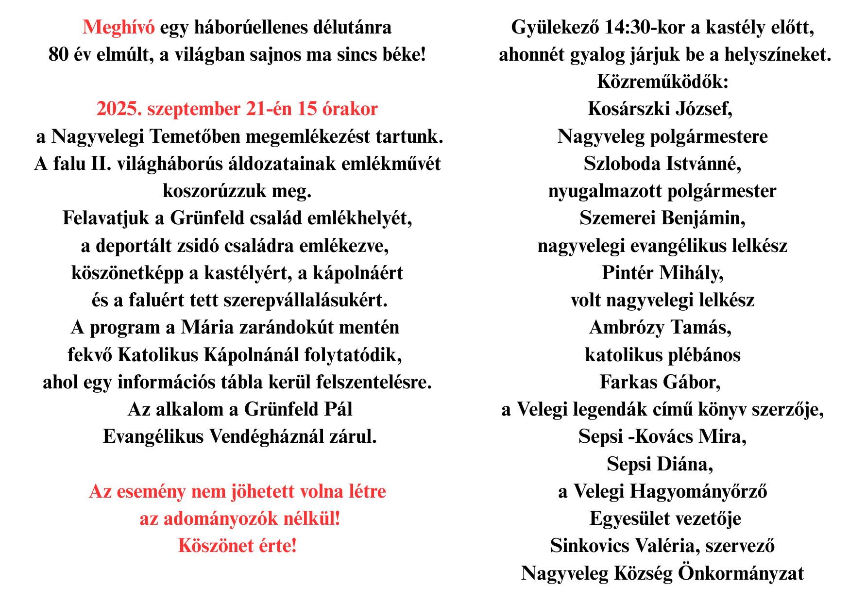 Adja Isten, hogy világszerte, és benne hazánkban is tartósan véget érjen az embercsoportok egymás iránti gyűlölködése. Ne az önzés, hanem a szeretet vezesse az embereket. A Ti nagyvelegi megemlékezésetek is ezt munkálhatja.