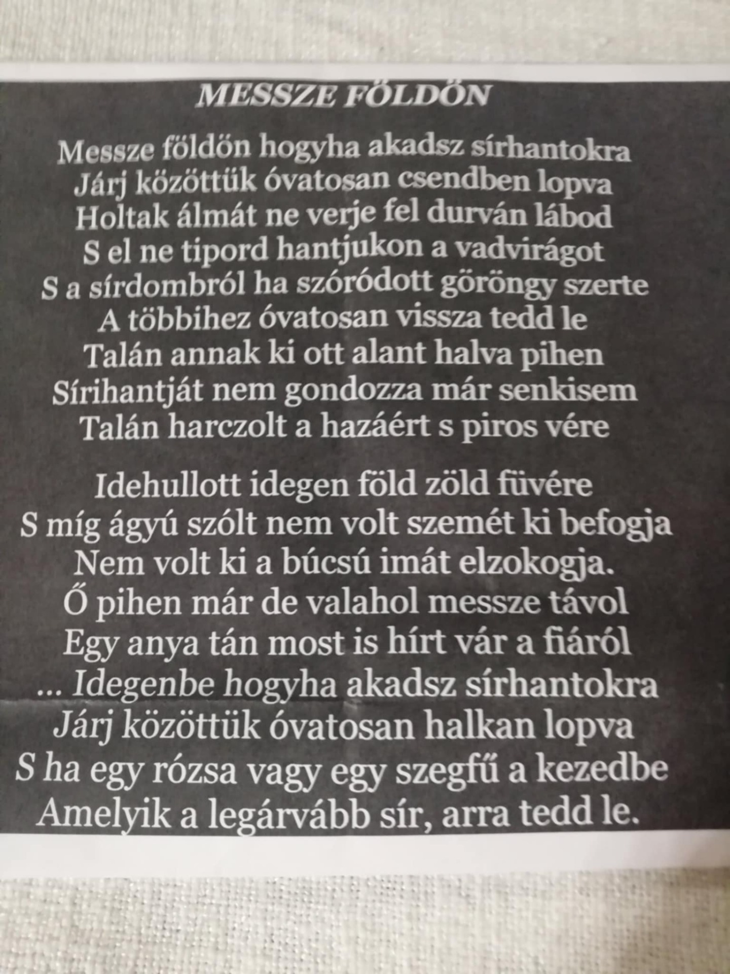Szloboda Istvánné nyugalmazott polgármester asszony erre az alkalomra digitalizáltatta a II. világháborús emlékmű avatásán készült filmet. Az emléknapon alábbi verset hallhattuk tőle. Érdekessége, hogy édesanyámtól kapta 33 éve. A költője egyelőre ismeretlen.